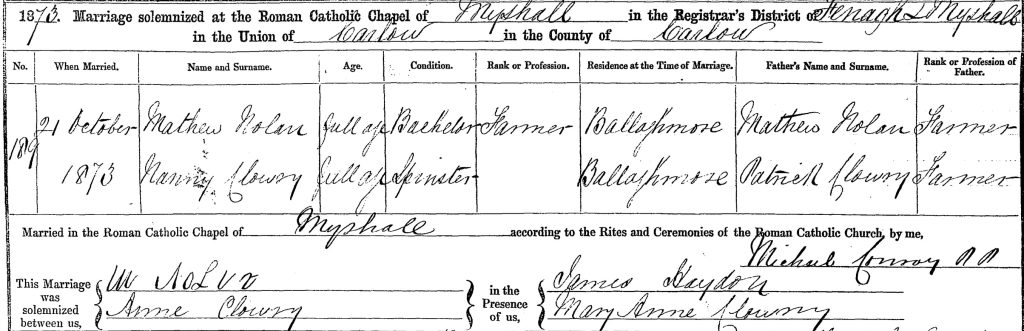 Church record: Mathew Nolan of Ballaghmore m. Anne Clowry, 21 Oct 1873 at Myshall >