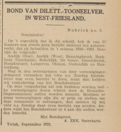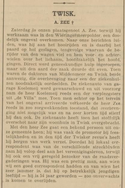 Dagblad nieuwe Hoornsche courant, 27-07-1936 TWISK. A. ZEE. Zaterdag is onzen plaatsgenoot A. Zee, terwijl hij werkzaam was in den Wieringermeerpolder, een doodelijk ongeval overkomen. Naar onze berichten luiden, was hij aan het hooirijden en is daarbij het paard op hol geslagen, tengevolge waarvan de berijder van den wagen viel en hem voor- en achterwielen over het lichaam, hoofdzakelijk het hoofd, gingen. Direct werd geneeskundige hulp ingeroepen, maar uit den aard der zaak duurde dit even. Toen waren de doktoren van Middenmeer en Twisk beide aanwezig, die overbrenging naar een der ziekenhuizen noodzakelijk oordeelden. De ziekenauto van garage Koelemeij werd gewaarschuwd en uit voorzorg nam de heer Koelemeij reeds een der verpleegsters uit „de Villa” mee. Toen men echter op het terrein van het ongeval arriveerde verkeerde de heer Zee reeds in zoo zorgwekkenden toestand, dat overbrenging niet mogelijk was en na zeer korten tijd stierf hij dan ook. De ziekenauto heeft toen het stoffelijk overschot naar zijn woonhuis in Twisk overgebracht. Met den heer Zee gaat een bekend persoon uit onze gemeente heen; hij was vaak de promotor bij feestelijkheden en in den tijd der Twisker revue’s heeft hij bergen van werk verzet. Doordat hij lokaal correspondent was van de verschillende streekbladen nam hij volop deel aan het vereenigingsleven, terwijl hij ook een vrij geregeld bezoeker van de raadsvergaderingen was. Hij was een prettig man, aan wien wij een goed correspondent hadden en van wien het zeer jammer is, dat hij op betrekkelijk jeugdigen leeftijd — hij is 54 jaar geworden — zoo onverwachts is komen te overlijden.