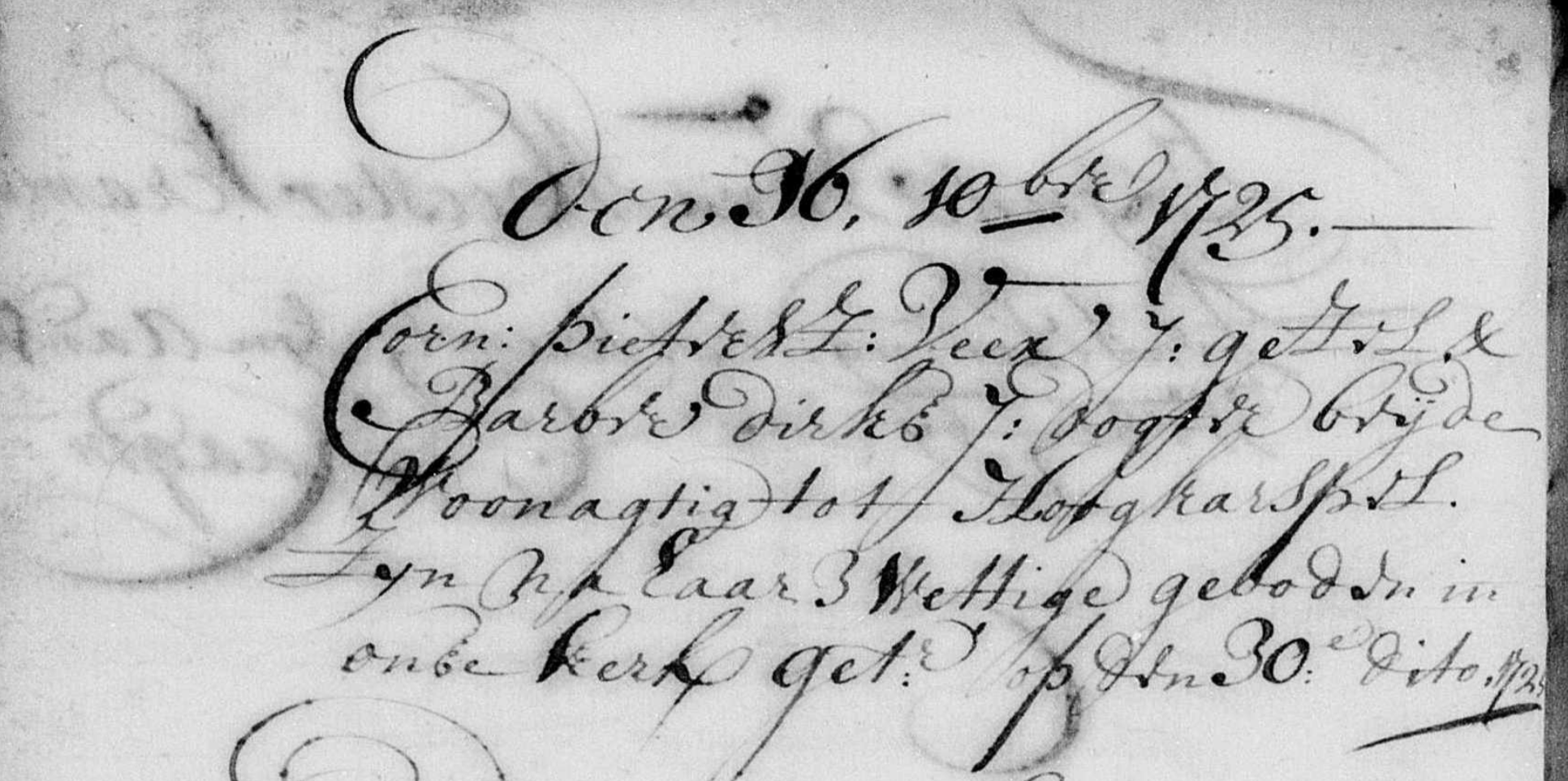 Cornelis Pieterzoon Veer b c.1700 + 06-Mar-1752 Hoogkarspel x Barber Dirks Snijer 30-Dec-1725 Hoogkarspel > b c.1705 + 6-Jan-1783 Hoogkarspel [>] # Ancestry profile: Cornelis Veer Timeline 16-Dec-1725 Cornelis Pieters Veer & Barbur Veer married on 30th Dec 1725 > 06-Jan-1783 Impost op begraven. Van Pieter Veer voor het lijk van Barber Dirks > 12-Jan-1783 Notarial deed, Pieter Cornelis Veer re. estate of his mother Barber Dirks. > Images