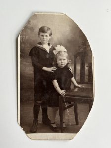This studio portrait is of Fred and his sister Nel. On the reverse is written “voor Tante Daatje”, “Freddy 6 jaar 9 maanden, Nelly 3 jaar”. The photographer is “…ale’s Studios, Spuistraat 61, The H…”. Tante Daatje is Fred’s mother Janna Cunera van Alphen’s younger sister Daatje van Alphen, who married Willem Smit in 1912. It can be dated to April of 1923. Nel turned 3 on April 6, 1923. Perhaps they marked the occasion with a trip to the photo studio, which was at Spuistraat 61 in Den Haag.