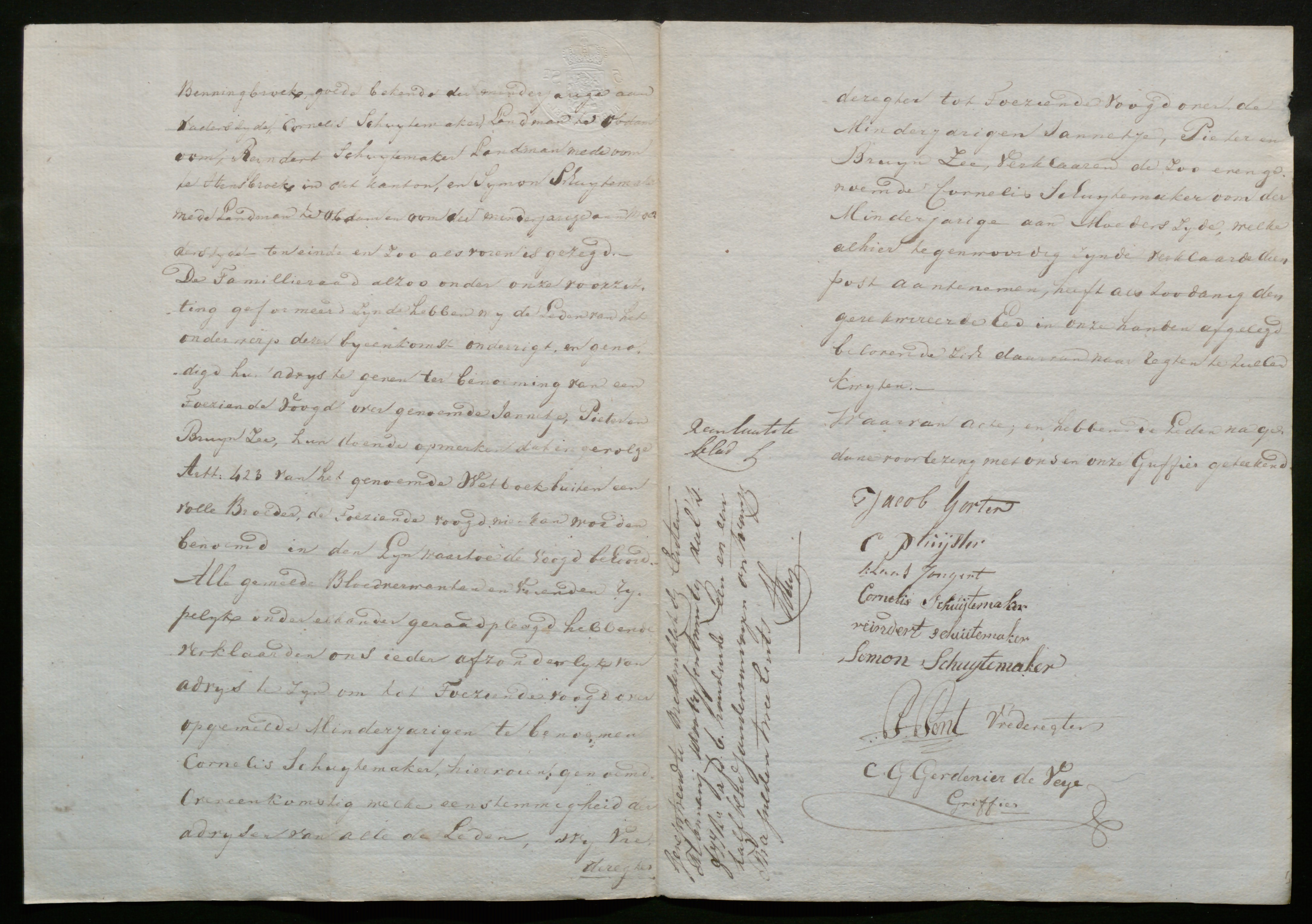 When a parent died, it was standard practice to go to the local District Court to discuss the consequences for the minor children, and appoint a second guardian. For this reason, Jan Zee went to the court of Medemblik on January 26, 1825. A familieraad, or council of family members, was appointed to consider the matter. It consisted of Jacob Gorter (Uncle, Aartswoud), Cornelis Pluijster (Neef, Aartswoud), Klaas Jongert (Known to the children, Benningbroek), and Cornelis, Reindert, and Symon Schuijtemaker (Obdam and Hensbroek, all uncles). The familieraad agreed that Cornelis Schuijtemaker, uncle of the children, would become co-guardian with Jan Zee over the children. Cornelis was Aaltje’s brother, and his own wife, Trijntje Leek, had died a year earlier.