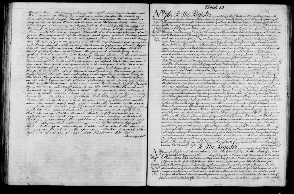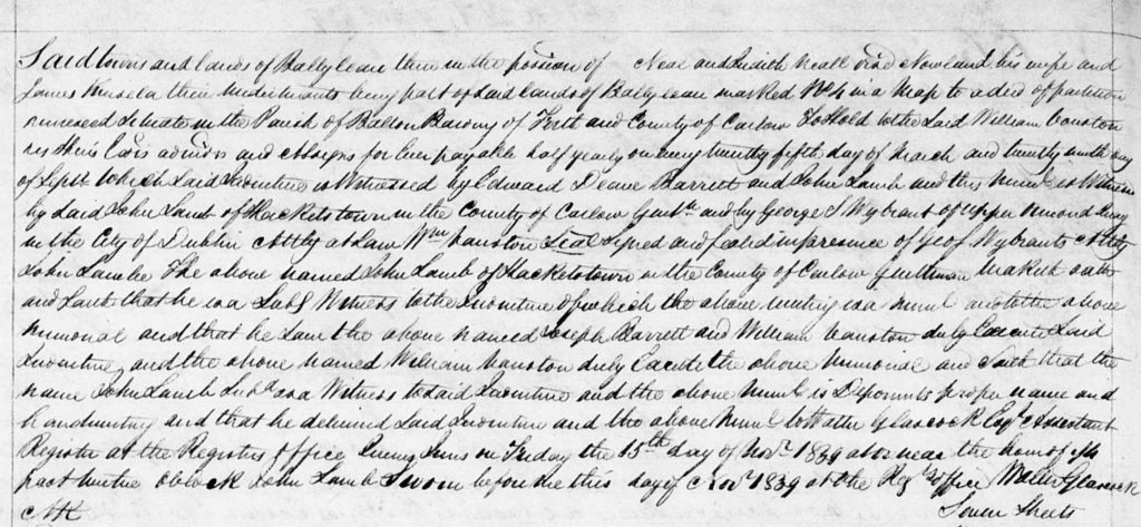 [2 Aug 1814] Ref. “in the year of our Lord 1811” between Joseph Barrett of Athy in the Co. of Kildare Esq., of the 1 part and Deane? Barrett of the City of Dublin, Esq. att at law and eldest son of the (afm) Joseph Barrett & Anne Barrett (alias?) Deane his wife, which (said?) Anne was one of the heiressess of Daniel Deane of the 2nd part, Thomas Ginly of () Co. Carlow, Charles Burrows of (the Farm Ho.??) of Carlow, of the 4th part, & (Allema?) Burrows of Carlow spinster younger daughter of the said Charles Burrows of the 5th part. (Reading?) that Wm Brownrigg then late of Ballylean, Catherine Brownrigg alias Deane his wife, James Burrows then of the city of Dublin & Elizabeth Burrows alias Deane his wife. The said Joseph Barrett & Anne Barrett, which Cath/e, Elizabeth and Anne were sisters and co-heiresses (at law?). By virtue of a lease in lives renewable for ever, (of the same) lands of Ballyleon, situate in parish of Ballon barony of Forth … bearing date of 16th Aug 1797, made between Wm Brownrigg and Catherine, James Burrows and Elisabeth), Joseph Barrett, and George Capel of Kilnock, William (Saul?), and James Thorpe. [Brownrigg, Burrows and Barrett divided the land into 3 equal parts] … a marriage was shortly intended to be solemnized between the said Edwd. Deane Barrett and (Ellinor?) Burrows … Bryan Reddy his undertenants. Witnessed by John Barrett, Thomas Burrows, and Anne Barrett of Athy, etc. 2nd of August, 1814.